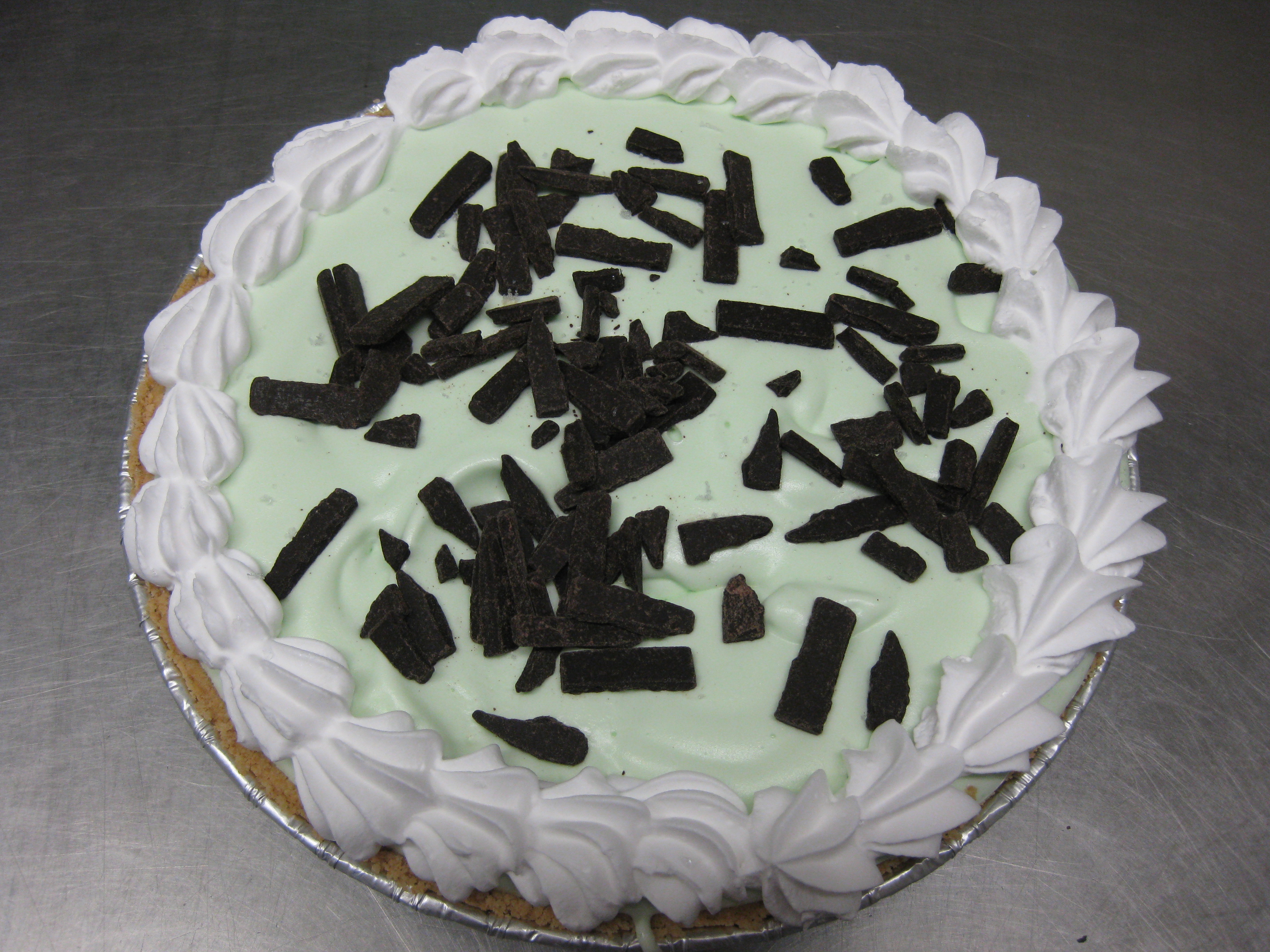 Grasshopper – Graham Cracker pie crust with plain mint (green) ice cream topped with chocolate chips and whipped cream.